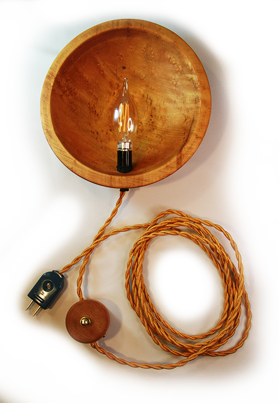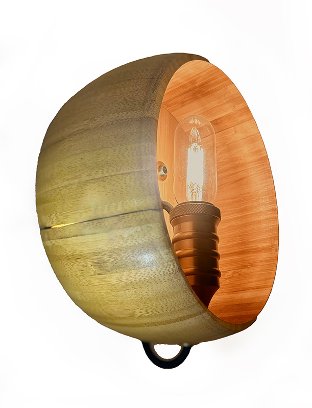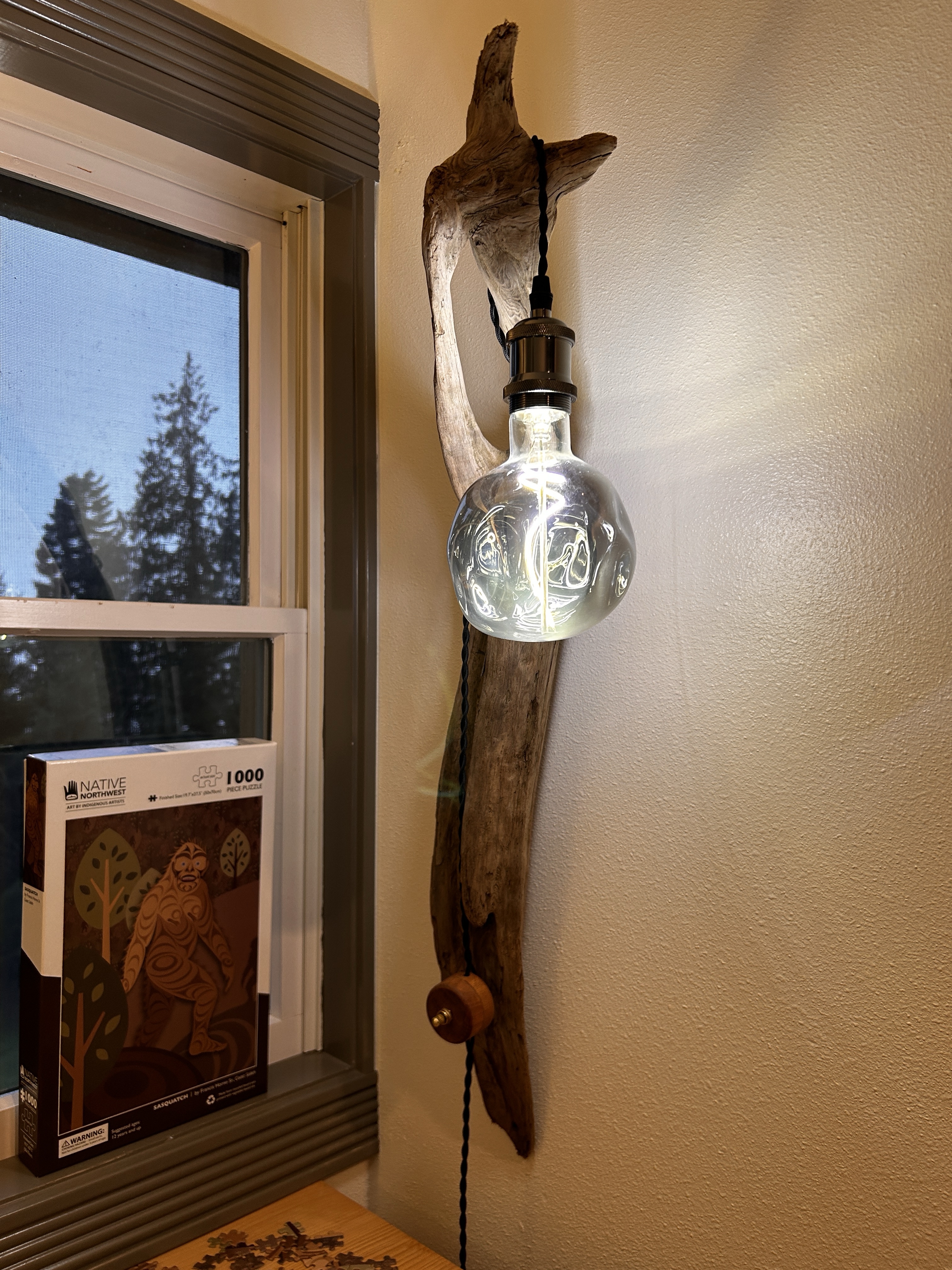 Driftwood SimpleOne of my first and still a favorite, driftwood wall light. Simple design with black, nylon twisted cord and custom wooden box with gold switch. Gun metal socket color gives the piece an industrial feel and oversize, unique LED bulb completes the look. The combination of woods and metal finishes gives this lighted sculpture its rustic, industrial vibe.