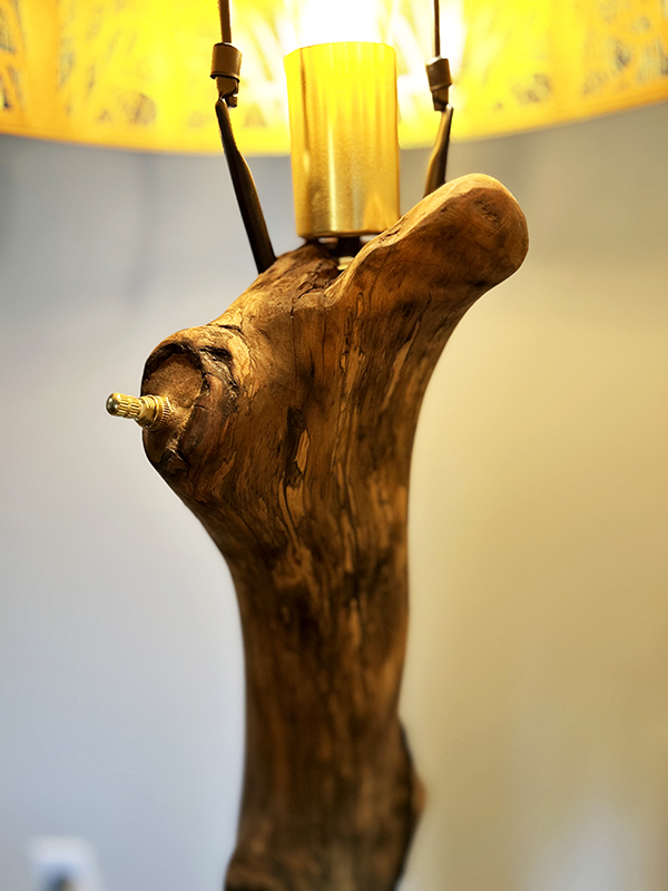 Floor Lamp Switch DetailSince every piece of driftwood is completely different, they each require time and problem solving to add wiring, lamp shades and switches. Here, wood clay is used to embed the switch into a hollowed out knot. Custom pieces were made to allow the lamp shade to sit at the proper height, and not cover the soft shape of this piece.