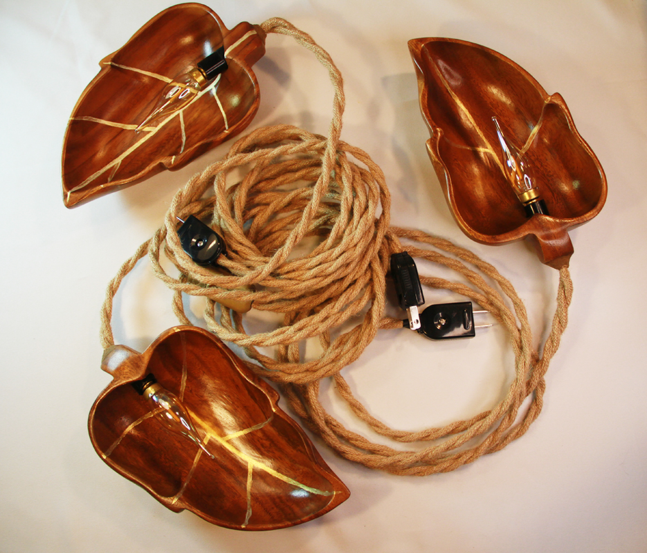 Munising Bowl DetailsMini chandelier sockets can be painted any color. Mini chandelier bulbs are available in many different styles as well. This is an example of our gold nylon cord for a vintage look. Pictured here is one of our custom wooden switch boxes with gold knob. Plugs can be custom ordered in a number of colors and styles. If you have a family heirloom or a wooden bowl or trinket that you would like reimagined into a lighted sculpture or fixture, let us know!