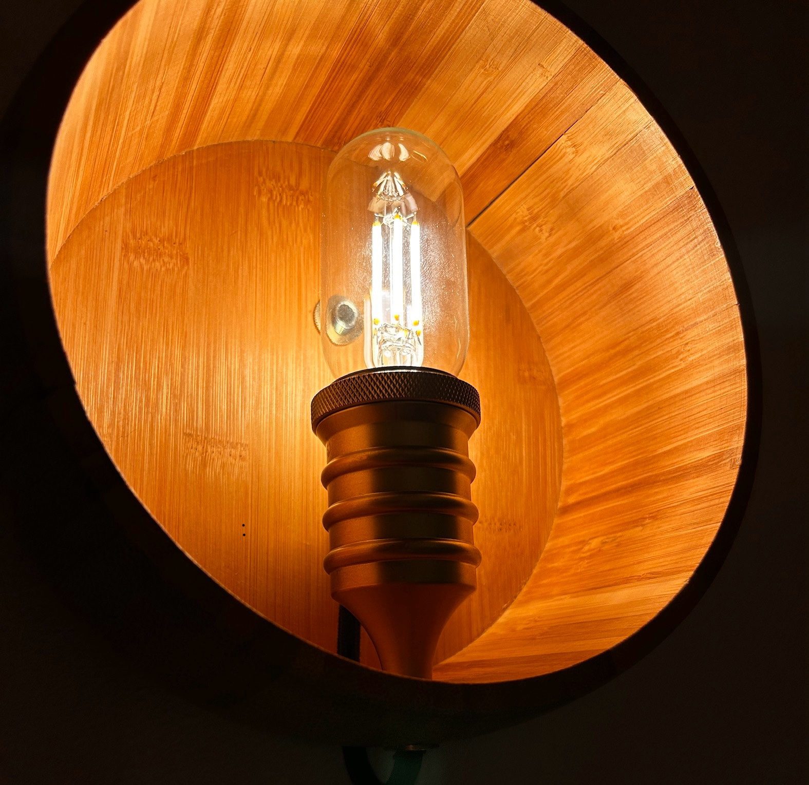 Bamboo BowlInterior view of Bamboo Bowl detail. Bowl pendants or sconces can be left natural, stained, glazed or painted. A variety of socket styles and colors are available.LED Edison bulbs, while our personal favorite, are available in many shapes and sizes, or can be replaced with another style of lightbulb if customer prefers.